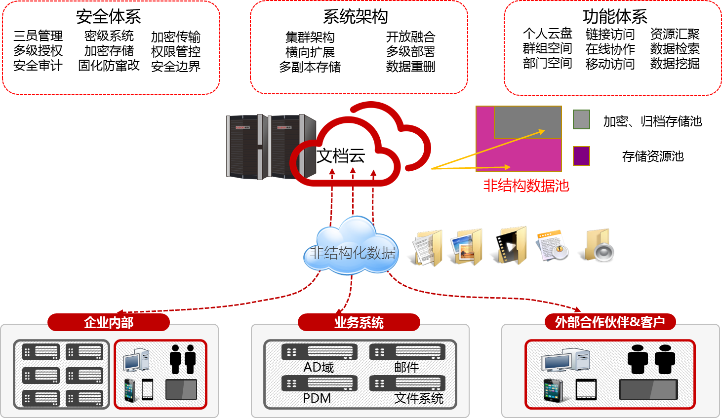 整體方案的設(shè)計(jì)是基于用戶的需求進(jìn)行規(guī)劃,從文檔的統(tǒng)一管理、安全存儲(chǔ)、靈活使用角度出發(fā),方案采用愛數(shù)AnyShare文檔云,實(shí)現(xiàn)對(duì)企業(yè)內(nèi)部員工PC端、移動(dòng)端、業(yè)務(wù)系統(tǒng)數(shù)據(jù)及與外部合作伙伴或客戶的數(shù)據(jù)進(jìn)行統(tǒng)一存儲(chǔ)管理。如下圖: