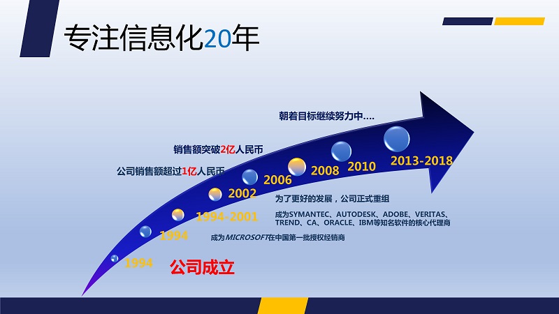 ? ? ? ?1994年成立至今,已經(jīng)有20多年。從一家只有5,6個(gè)人的微型公司,穩(wěn)步發(fā)展成現(xiàn)在有一定規(guī)模和知名度的中型企業(yè),業(yè)績也由當(dāng)年年銷售100來萬,到現(xiàn)在一年2個(gè)多億。前進(jìn)腳步我們還在繼續(xù),新技術(shù)換代的時(shí)代又來領(lǐng),我們將一如既往得幫助我們的客戶邁向數(shù)字化轉(zhuǎn)型,邁向AI,邁向云服務(wù)。