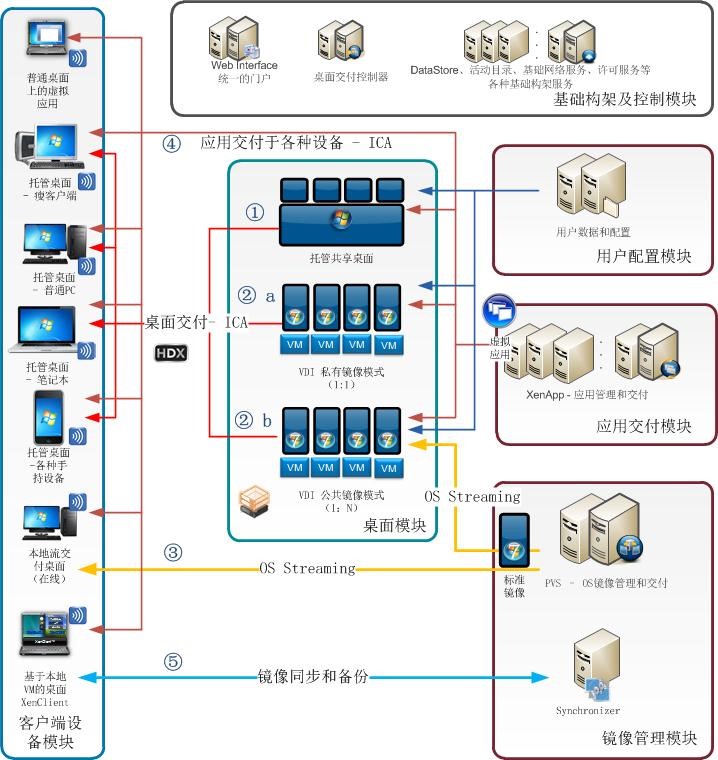 思杰的XenDesktop桌面虛擬化結(jié)合了思杰特有的FlexCast?交付技術(shù),可通過(guò)單一解決方案滿足各種要求。在思杰的桌面虛擬化解決方案中,雖然面對(duì)不同的應(yīng)用場(chǎng)景和不同需求的用戶,需要利用到不同的部署方式,但是很多構(gòu)架和組件,如統(tǒng)一的訪問(wèn)門戶-Web Interface, 統(tǒng)一的應(yīng)用交付模塊,統(tǒng)一的OS鏡像管理和交付模塊、統(tǒng)一的高效交付協(xié)議ICA和HDX技術(shù),以及共享的后臺(tái)基礎(chǔ)構(gòu)架等等,構(gòu)成了一個(gè)靈活的統(tǒng)一終端虛擬化云平臺(tái)。